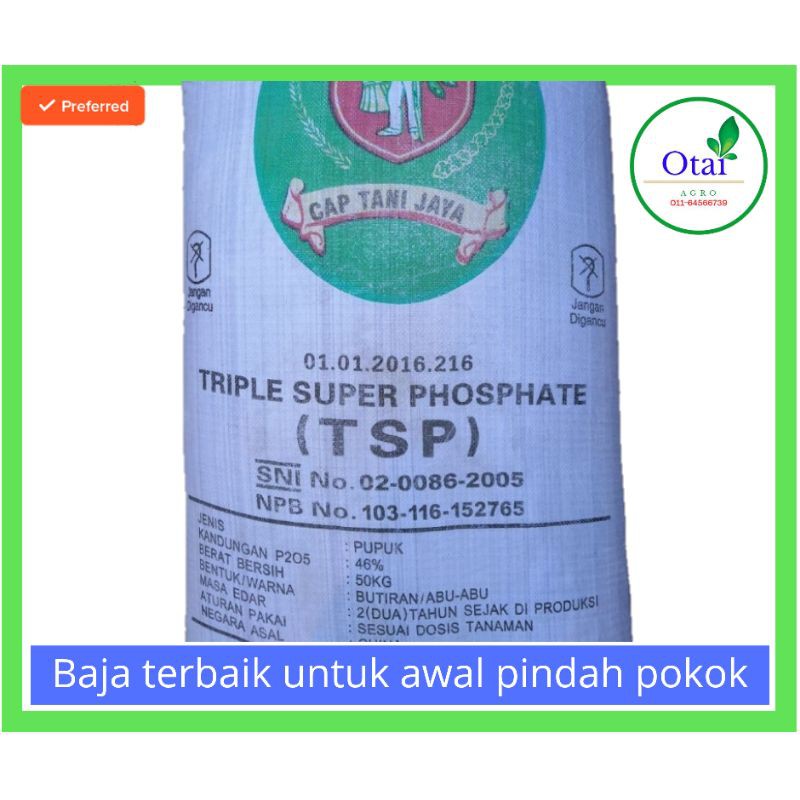 Bagi baja kimia pula triple super phosphate TSP boleh digunakan dengan kadar 35kg1000m minggu. Untuk petak kekacang atau rumput bercampur kekacang kadar pembajaan adalah P. TSP ialah singkatan dari triple super phosphate yang berarti tempat penyuburan tanah untuk memperbaiki kualitas tanaman dalam bidang pertanian baik untuk perkebunan sawah ladang maupun sektor yang lainnya.