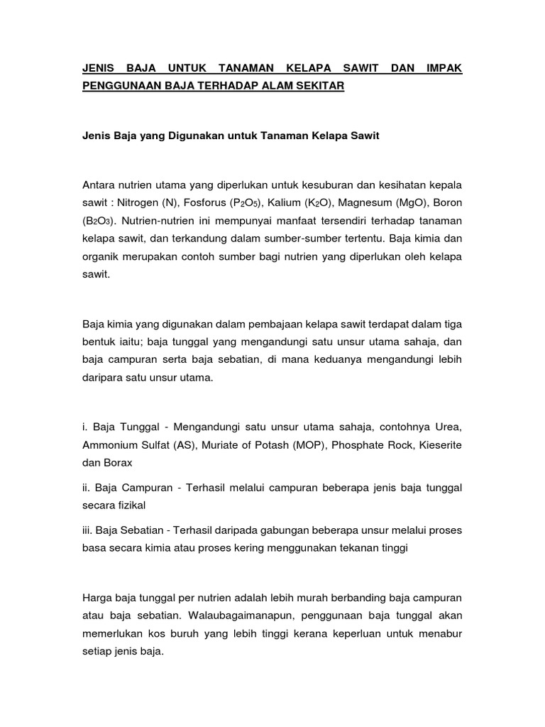 Satu lagi contoh baja biru yang digunakan untuk pokok kelapa sawit dewasa. Secara amnya terdapat empat kaedah pengurusan rumpai yang boleh dilaksanakan di. Penggunaan baja kimia mempunyai kelemahan contohnya larian baja nitrogen ke sumber air.